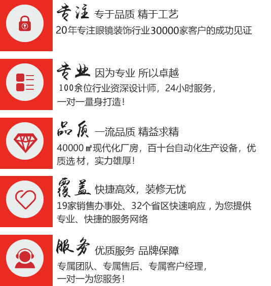 陽光視線是一家集設計、研發、生產、安裝、施工為一體的綜合性企業!20年專注服務于眼鏡行業,擁有19個銷售網點,遍布32個省份;500多名員工,其中設計研發、工程安裝、管理、營銷、等中高級執行人才160余名;2000平米的辦公環境;公司研發能力強,并能迅速將研發成果轉化為生產與商業效益;擁有超具規模的展柜生產基地、生產流程、工藝技術以及生產設備。